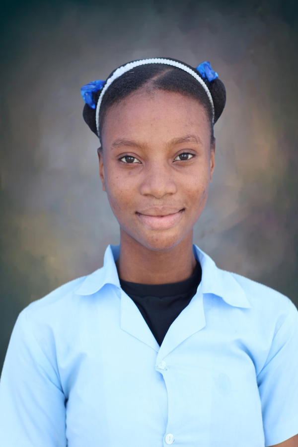 Chaina  is a bright fifteen year old from the village of Galette Chambon. She has two brothers and four sisters and they all live with their aunt. Their mother died while giving birth to her youngest sister two years ago.  Chaina loves children and she loves to teach her younger siblings things. She believes that one day she can teach other children in the village how to read and write. She is very thankful that she can go to school, but her aunt cannot afford to pay her tuition, so she must have a sponsor to continue.  She absolutely loves school and wants to be able to continue! Her favorite subject is mathematics. When she’s not in school, she enjoys helping her aunt with the children and doing other housework. She also enjoys tutoring other children in the village in their school work and going to church. When she grows up, she wants to become a teacher.